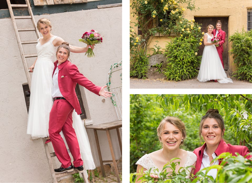 Wieder bei der Eselsmühle angelangt beginnt dort eine fröhliche Hochzeitsfeier, mit gut gelaunten Gästen und einer festlich geschmückten Location. Es entstehen viele Gruppenfotos, der Brautstrauß wird geworfen, und ich fange die Stimmung des unbeschwerten Tages in der Sommersonne ein. Die Gäste haben sich viel für mein Hochzeitspaar ausgedacht, es gibt Geschenke und Spiele, Reden und schöne Überraschungen, die sich vor allem auch Conny und Bianca gegenseitig bereiten.